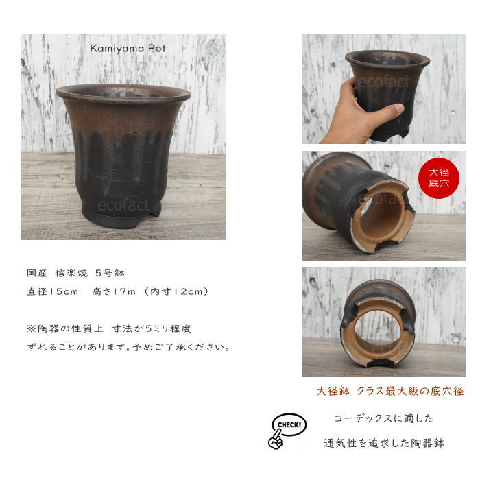 ※ 返品交換不可 「横すじ」について→鉢側面の「横すじ」は型から商品を抜いてから削る際に出来るスジになります。信楽焼の陶土は粗目のため磁器とは違い使用している粘土には必ずと言っていいほど細かい石などが入っております。性質上 仕上げ時に削り仕上げをしている物には大小違いはありますが写真のような痕はどうしても残ってしまいます。これらの「横すじ」についてスタンダードということでご理解いただきますようお願い申し上げます。 なお「横すじ」のある鉢を敬遠される方、「横すじ」の無いものを好まれる方はご遠慮いただいたほうが賢明です。なお出荷はランダムになります。リクエストもご遠慮ください。