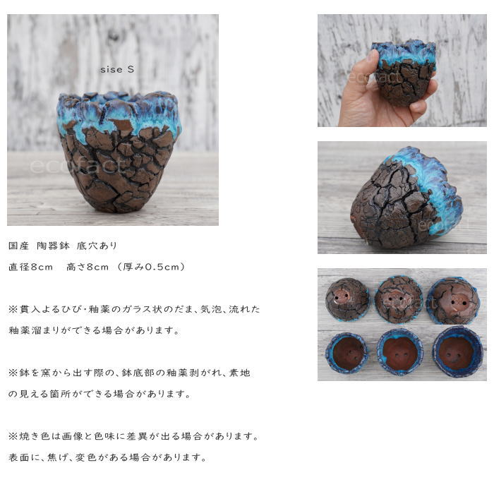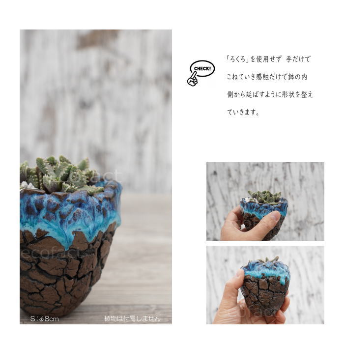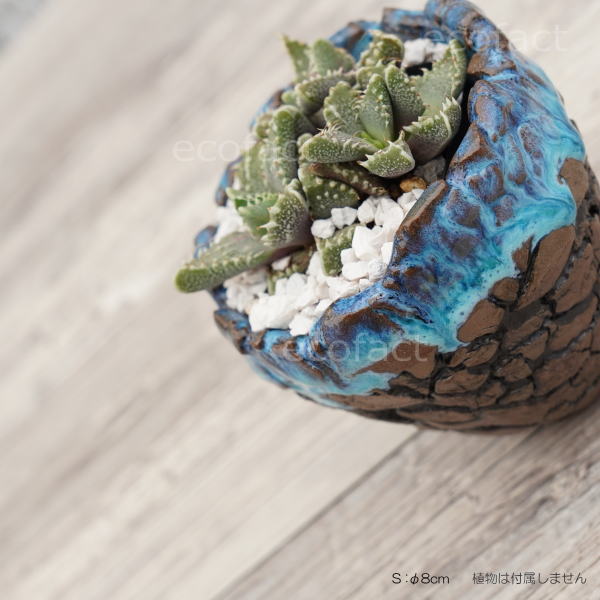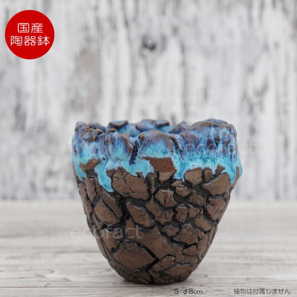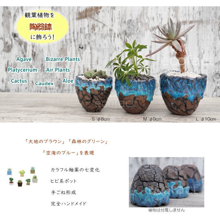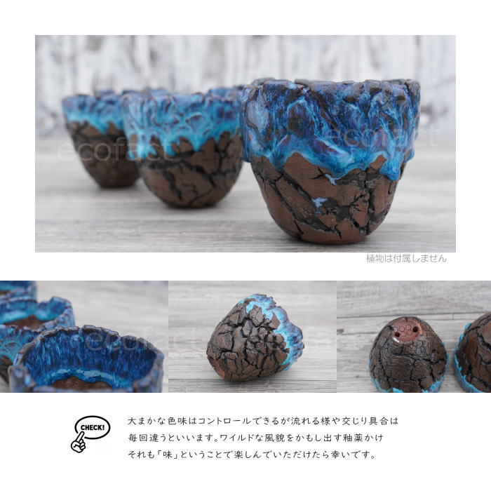 塊根植物・多肉植物あう「ヒビ系ポット」で カラフルな釉薬がワイルドに垂れる様が真っ先に目をひきます。釉薬は独自の配合で 自然の中にある色で 「大地のブラウン」 「森林のグリーン」 「空海のブルー」を表現したものです。