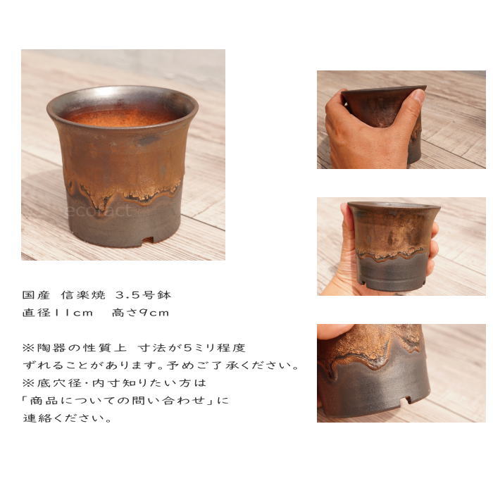 ※ 返品交換不可 「横すじ」について→鉢側面の「横すじ」は型から商品を抜いてから削る際に出来るスジになります。信楽焼の陶土は粗目のため磁器とは違い使用している粘土には必ずと言っていいほど細かい石などが入っております。性質上 仕上げ時に削り仕上げをしている物には大小違いはありますが写真のような痕はどうしても残ってしまいます。これらの「横すじ」についてスタンダードということでご理解いただきますようお願い申し上げます。 なお「横すじ」のある鉢を敬遠される方、「横すじ」の無いものを好まれる方はご遠慮いただいたほうが賢明です。なお出荷はランダムになります。リクエストもご遠慮ください。