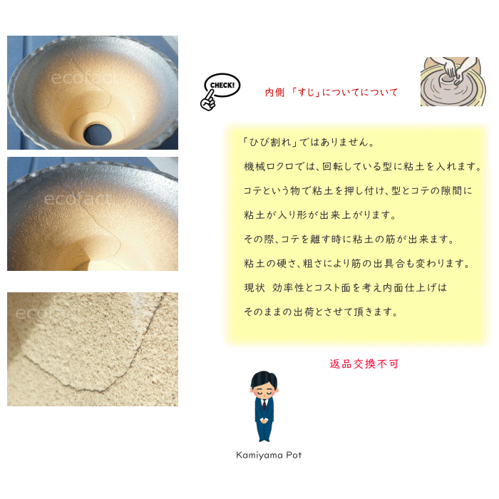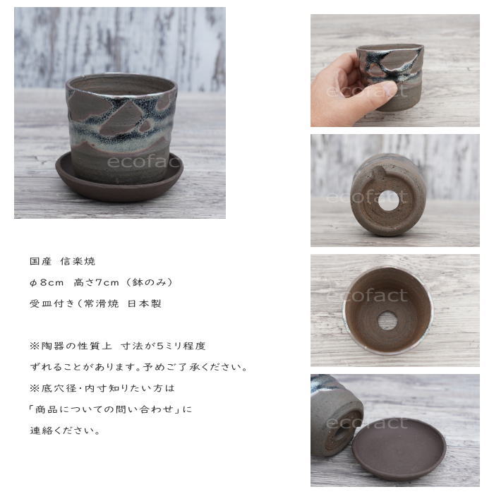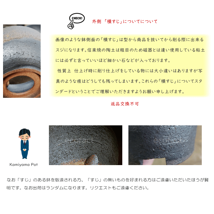 ※ 返品交換不可 「横すじ」について→鉢側面の「横すじ」は型から商品を抜いてから削る際に出来るスジになります。信楽焼の陶土は粗目のため磁器とは違い使用している粘土には必ずと言っていいほど細かい石などが入っております。性質上 仕上げ時に削り仕上げをしている物には大小違いはありますが痕はどうしても残ってしまいます。これらの「横すじ」についてスタンダードということでご理解いただきますようお願い申し上げます。なお「横すじ」のある鉢を敬遠される方、「横すじ」の無いものを好まれる方はご遠慮いただいたほうが賢明です。なお出荷はランダムになります。リクエストもご遠慮ください。