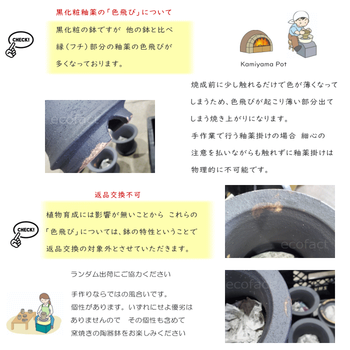 ※陶器の性質上 焼き色の違い・釉薬のむらなどが生じる場合があります。なお植木鉢なので内面は特に施行はございません。破損・欠け・ひびがないかすぐに検品ください。お好みによるお色の指定・返品交換はご遠慮ください。