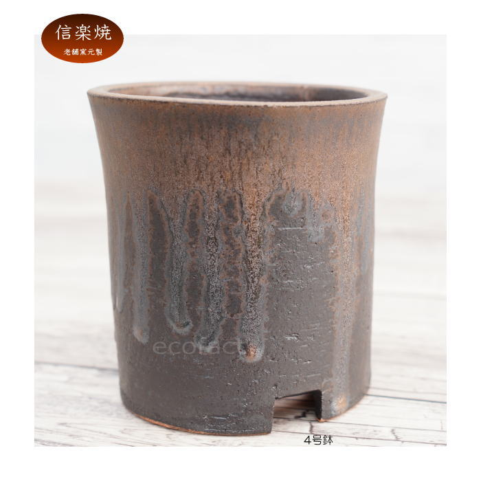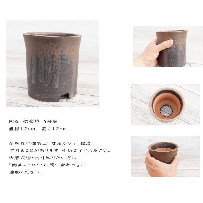 ※ 返品交換不可 「横すじ」について→鉢側面の「横すじ」は型から商品を抜いてから削る際に出来るスジになります。信楽焼の陶土は粗目のため磁器とは違い使用している粘土には必ずと言っていいほど細かい石などが入っております。性質上 仕上げ時に削り仕上げをしている物には大小違いはありますが写真のような痕はどうしても残ってしまいます。これらの「横すじ」についてスタンダードということでご理解いただきますようお願い申し上げます。 なお「横すじ」のある鉢を敬遠される方、「横すじ」の無いものを好まれる方はご遠慮いただいたほうが賢明です。なお出荷はランダムになります。リクエストもご遠慮ください。